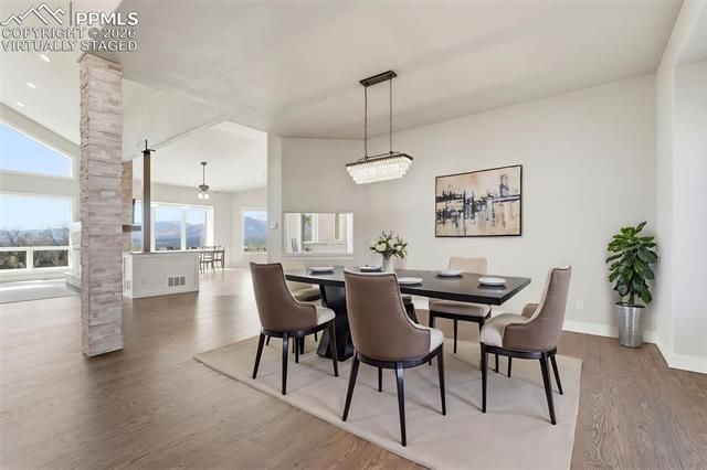 Where timeless architecture meets elevated mountain luxury, this extraordinary residence delivers an unparalleled living experience with sweeping, unobstructed views showcased from nearly every room. Perfectly positioned to capture the grandeur of Pikes Peak and the Front Range, the home is a masterclass in refined design, blending classic elegance with modern sophistication against a backdrop of serene natural beauty. Upon entry, the main level unfolds in dramatic fashion, where soaring vaulted ceilings, rich hardwood floors, and expansive walls of glass create a light-filled interior that seamlessly brings the outdoors in. Every space is thoughtfully oriented to maximize the breathtaking vistas, offering a constant connection to the surrounding landscape. The great room is both grand and inviting, anchored by a striking floor-to-ceiling stone fireplace, while tinted windows and automated coverings provide effortless comfort and privacy. A tranquil water feature enhances the ambiance, creating a sense of calm throughout. At the heart of the home, the gourmet kitchen is designed for both everyday living and elegant entertaining, flowing seamlessly into the main living areas and view-filled outdoor spaces. The main-level owner’s suite is a true sanctuary, privately situated to capture stunning views and complete with its own fireplace, dual custom walk-in closets, and a spa-inspired five-piece bath designed for ultimate relaxation. The fully finished walk-out lower level extends the home’s luxury, featuring three spacious bedrooms and a beautifully appointed wet bar—ideal for hosting guests or creating a private retreat. Meticulously maintained as a secondary residence, the home presents in pristine, like-new condition. Located within the highly sought-after District 20 school system and offering convenient access to both Colorado Springs and Denver, this exceptional property delivers the perfect balance of privacy, prestige, and panoramic mountain living.