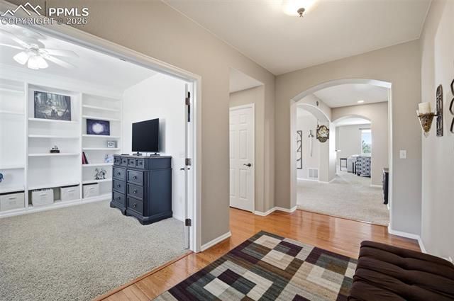 A refined blend of timeless elegance and modern comfort, this beautifully appointed 5-bedroom plus office residence is ideally situated in the heart of High Meadows—a sought-after community known for its welcoming atmosphere, scenic surroundings, & convenient proximity to neighborhood schools. Thoughtfully designed for both everyday living and elevated entertaining, the home offers an exceptional balance of style, function, & serene Colorado living. From the moment you step inside, you’re greeted by an abundance of natural light that fills the open-concept layout, enhanced by soaring ceilings & expansive windows that frame picturesque views. The great room creates a warm yet sophisticated focal point, anchored by a gas fireplace and seamlessly connected to the main living spaces, creating an effortless flow throughout. At the center of the home, the chef’s kitchen is both stylish & highly functional, featuring 42-inch cabinetry, sleek black stainless steel appliances, & a generous center island designed for gathering and conversation. Adjacent breakfast nook w/walk-out, and living areas make hosting feel natural and inviting, while a well-appointed main-level laundry room with utility sink adds everyday convenience. The owner’s suite offers a peaceful retreat, complete w/a private sitting area and a spa-inspired five-piece bath featuring dual vanities, a soaking tub, and a walk-in shower. Two expansive walk-in closets provide exceptional storage & organization, along w/a bonus sitting area. The finished walk-out lower level expands the home’s versatility with spacious recreation areas, three additional bedrooms, full bath, gas fireplace, 9-foot ceilings, second laundry hook-ups, ample storage areas, and a wet bar. Dual water heaters enhance efficiency and comfort. Outdoor living is equally impressive, w/a covered patio that invites relaxation while taking in sweeping views and Colorado’s unforgettable sunsets—perfect for quiet evenings or effortless entertaining.